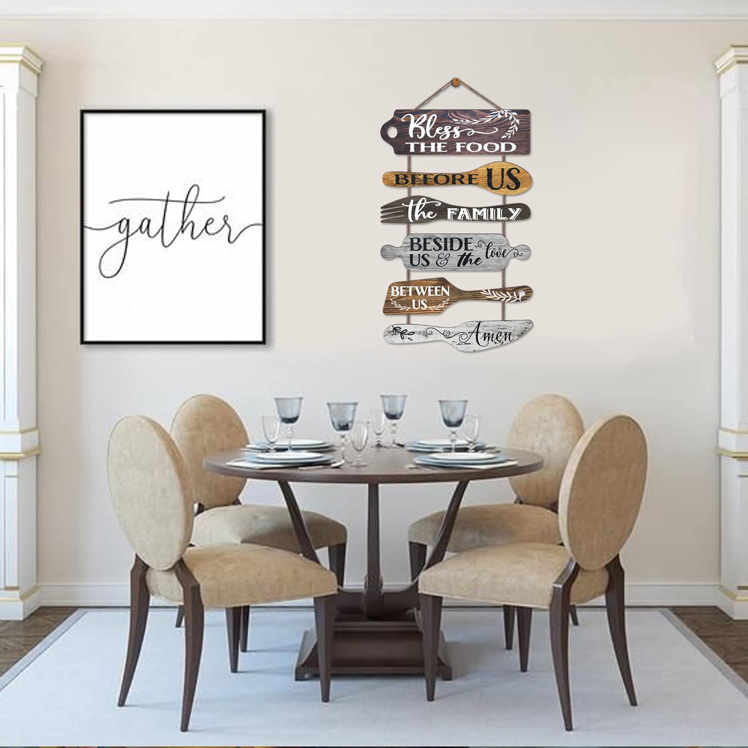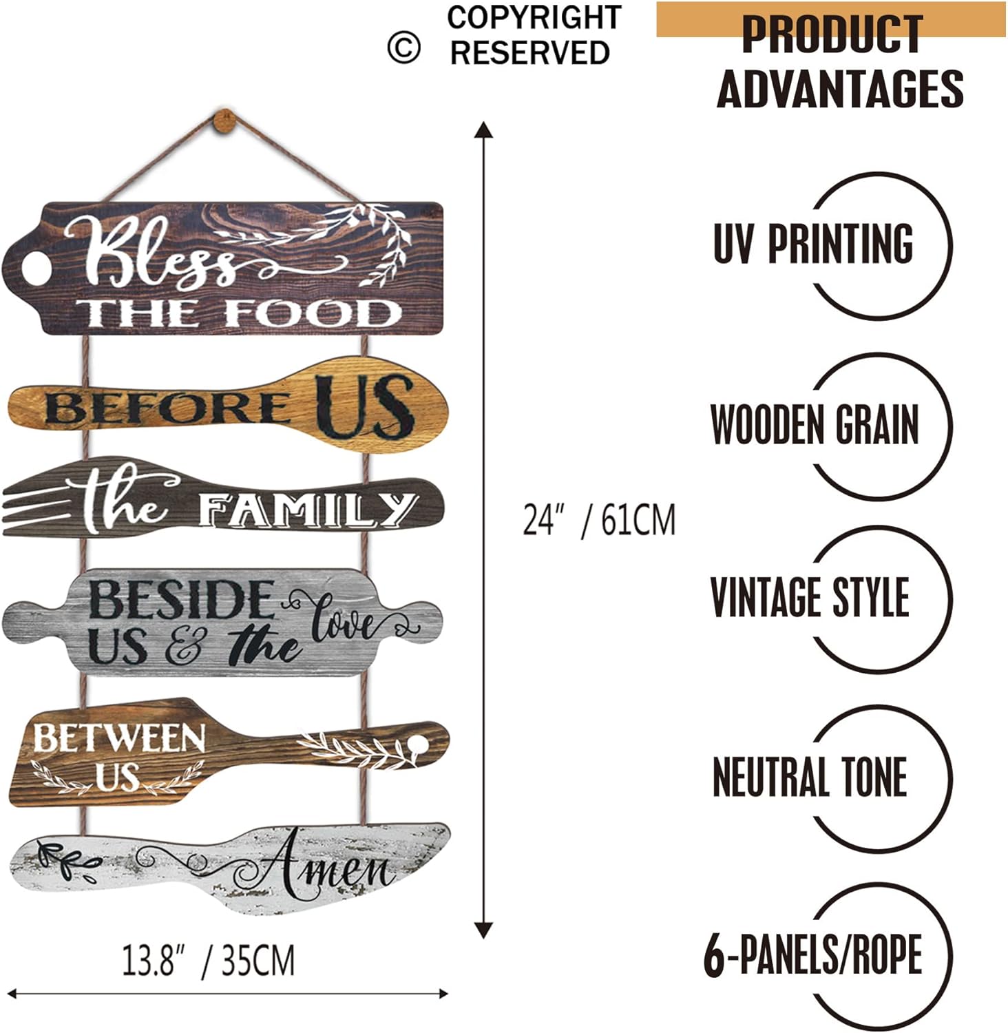 - FARMHOUSE KITCHEN DECOR: Consists of 6 piece cut out collage plaques with pop saying: bless the food before us, the family beside us, and the love between us, Amen. Remember daily prayer before meal,very devoutly thank God for the food,cherish food and love each other. Distressed & rustic looking for your dining room, kitchen. Printed withreligious & lovely words.