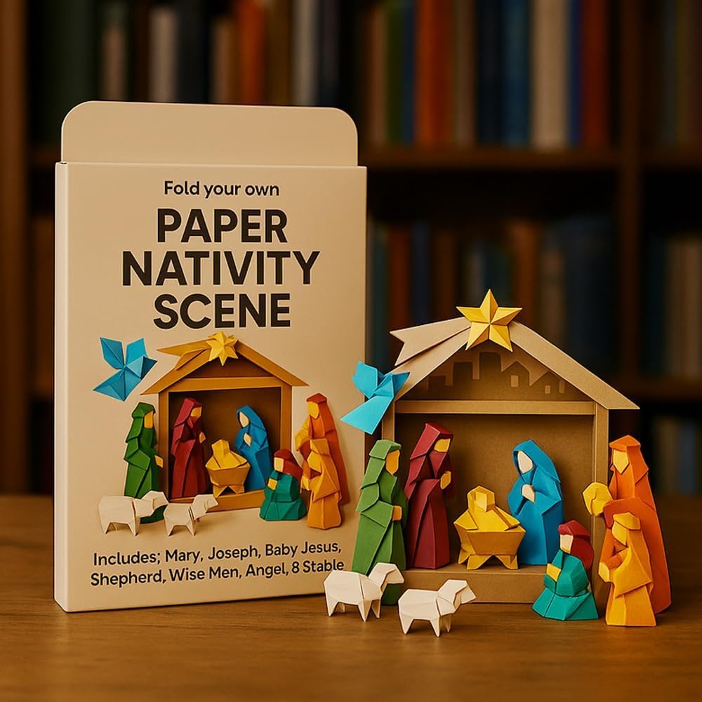 - Create Your Own Christmas Nativity Scene: This beautifully designed DIY paper craft kit lets you fold and assemble your very own paper nativity, complete with Mary, Joseph, Baby Jesus, the Three Wise Men, shepherds, and even sheep