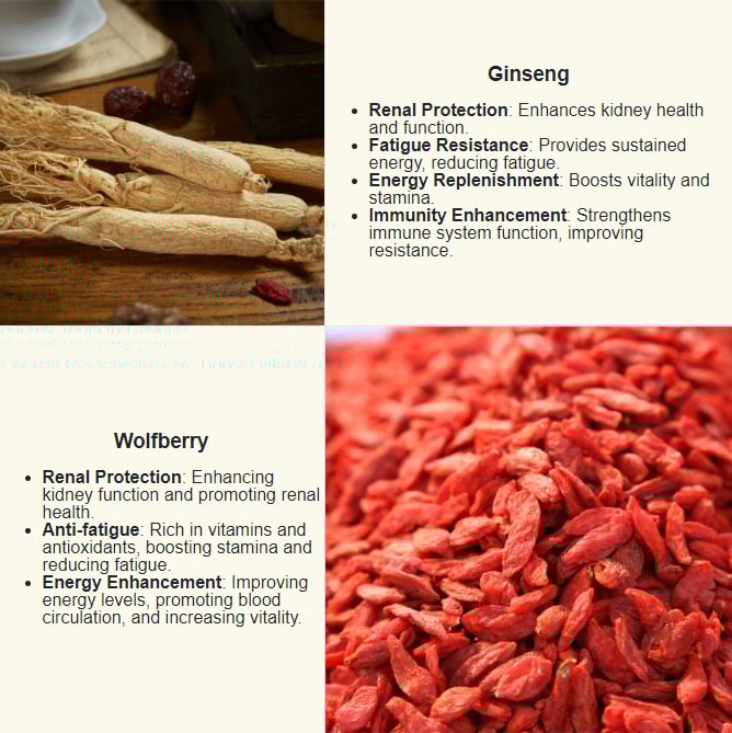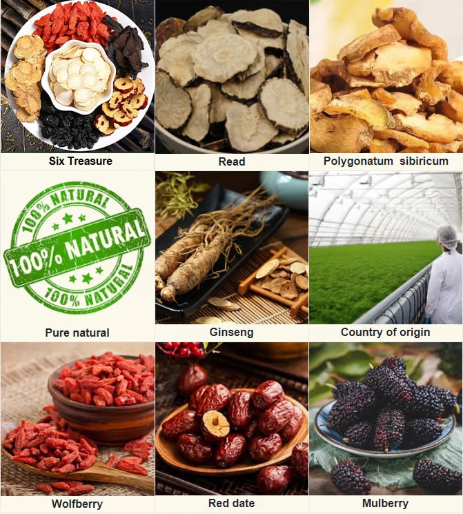 Ingredients:Ginseng(Five years or less artificial planting)、Wolfberry、Red wolfberry、Jujube、Barley、Maca、Black wolfberry、Mulberry
